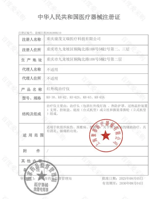 治疗仪主要由:治疗头(包括红外线灯泡 、热防护罩、过热温控装置)支臂、控制盒、底座(台式机型)或立柱和脚架带脚轮(立式机型)组成。