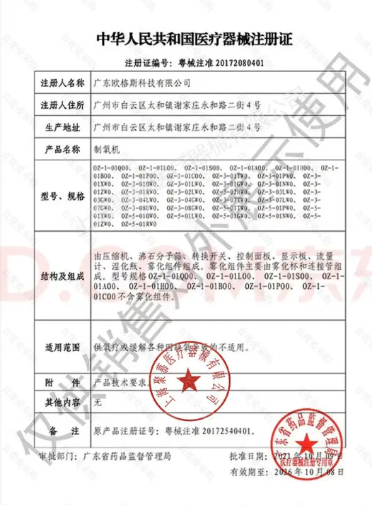 由压缩机、沸石分子筛、转换开关、控制面板、显示板、流量计、湿化瓶、雾化组件组成。雾化组件主要由雾化杯和连接管组成。型号规格OZ-1-01QO0、OZ-1-01LO0、OZ-1-01SO0、OZ-1-01AO0、OZ-1-01HO0、OZ-1-01BO0、OZ-1-01PO0、OZ-1-01CO0不含雾化组件。